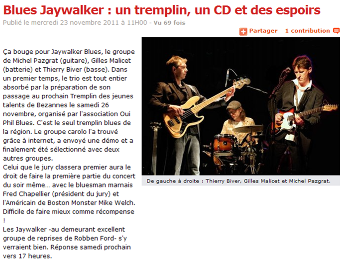 JAYWALKER C'est le groupe gagnant du tremplin qui ouvre cette 4ème édition du Blues In Bezannes et donne le ton : musique dynamique et puissante plutôt blues rock mais super!!!!